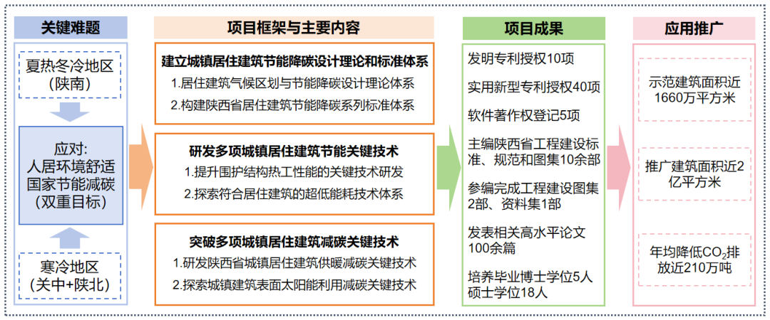 本成果由中聯(lián)西北院牽頭,聯(lián)合西安建筑科技大學(xué)、陜西西咸新區(qū)灃西新城能源發(fā)展有限公司共同研發(fā)完成。城鎮(zhèn)居住建筑實(shí)施能耗和碳排放“雙控”是建筑領(lǐng)域?qū)崿F(xiàn)“雙碳目標(biāo)”的重要途徑。研究團(tuán)隊(duì)建立了城鎮(zhèn)居住建筑“節(jié)能降碳”設(shè)計(jì)理論體系,制定了城鎮(zhèn)居住建筑節(jié)能減碳系列標(biāo)準(zhǔn),為城鎮(zhèn)居住建筑節(jié)能減碳的實(shí)施提供了理論支持和技術(shù)支撐。研發(fā)了熱工性能提升的圍護(hù)結(jié)構(gòu)和超低能耗圍護(hù)結(jié)構(gòu)等城鎮(zhèn)居住建筑節(jié)能關(guān)鍵技術(shù),大幅度降低了建筑能耗。研發(fā)了水源熱泵蓄混水供暖技術(shù)、中深層無干擾地?zé)崮芗夹g(shù)、光電光熱利用等建筑減碳關(guān)鍵技術(shù),顯著降低了城鎮(zhèn)居住建筑碳排放。項(xiàng)目授權(quán)發(fā)明專利10多項(xiàng)、實(shí)用新型專利40余項(xiàng)、軟件著作權(quán)5項(xiàng);主編陜西省工程建設(shè)標(biāo)準(zhǔn)、規(guī)范和圖集10多部;發(fā)表核心論文100余篇;推廣應(yīng)用面積超過2億㎡。研究創(chuàng)新成果提升了城鎮(zhèn)建筑的綜合性能,減少能源消耗和碳排放,在西北首個(gè)超低能耗居住建筑項(xiàng)目高新天谷雅舍、西安交大創(chuàng)新港等項(xiàng)目得到成功應(yīng)用,經(jīng)濟(jì)、社會和環(huán)境效益顯著,推廣應(yīng)用前景廣闊。